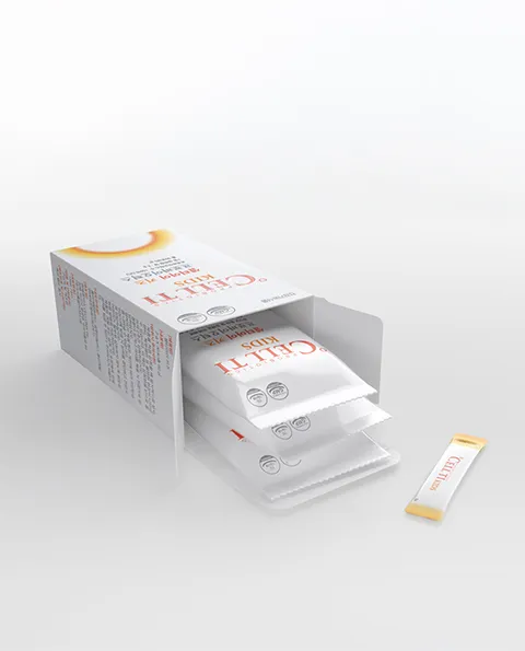 셀티아이 키즈는 물이나 음료 등에 섞어 먹을 수 있는 스틱(분말) 제품으로 만 10세 미만의 아이들도 쉽게 섭취할 수 있습니다.