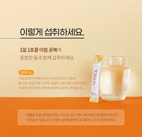 2주 후 편안한 상태가 되면 1일 1캡슐 또는 1일 1포로 섭취하면 됩니다. 불편 현상이 지속되면 셀로닉스 고객센터(1588-7451)로 연락 바랍니다.