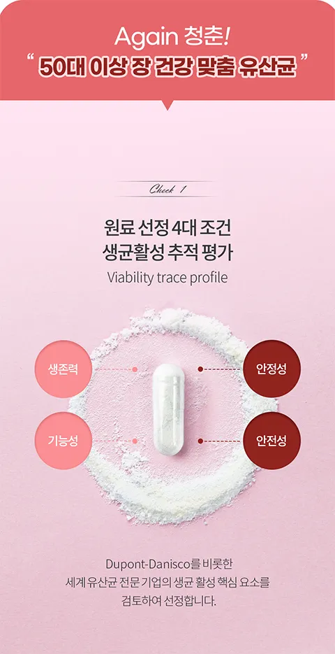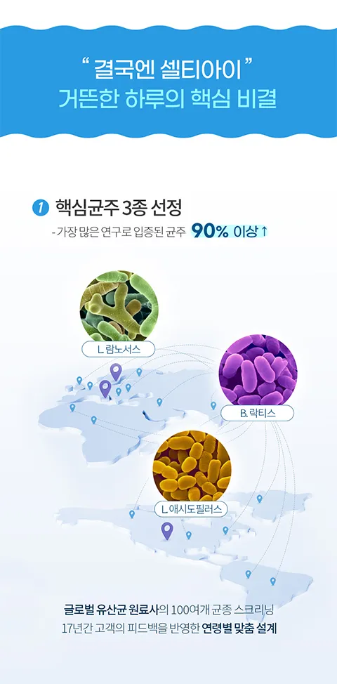 비피더스균이 급격히 감소하는 연령대를 위해 비피도박테리움 락티스 비율을 강화하고, 비피도박테리움 롱검과 비피도박테리움 비피덤을 추가 균주로 조성했습니다.