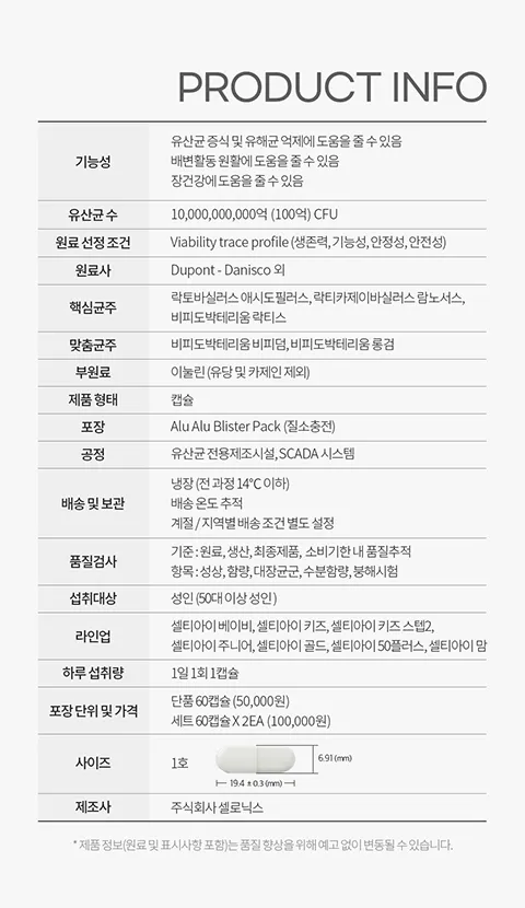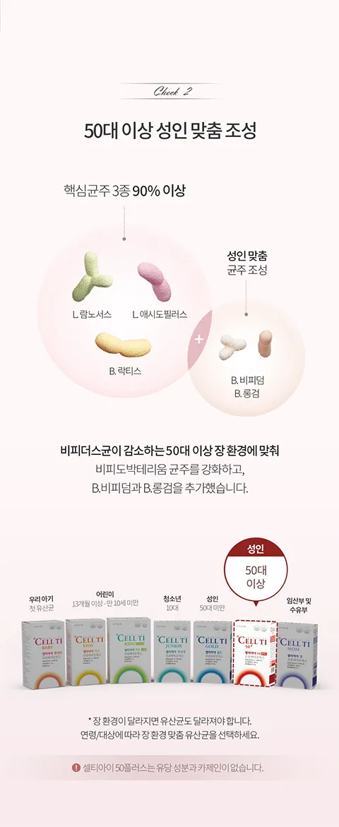 셀티아이 50 플러스는 비피도박테리움 균주를 강화한 제품으로 50대 이상 성인을 위한 제품입니다.