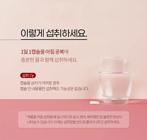 아침 공복에 충분한 물과 함께 섭취하세요. 위산의 영향을 최소화하여 장내 유산균 활동에 도움을 줍니다.