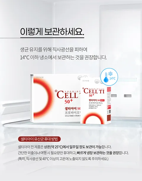 셀티아이 전 제품은 상온(약 25℃)에서 일주일 정도 보관이 가능합니다. 간단한 외출이나 여행 시 필요량만 휴대하고, 빠르게 냉장 보관하는 것을 권장합니다.