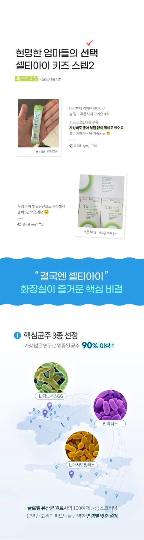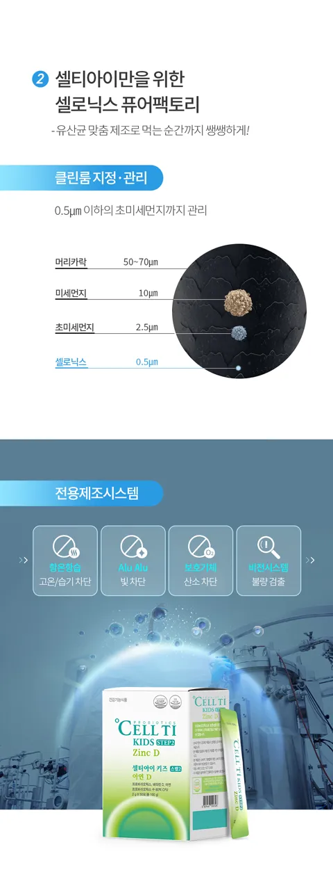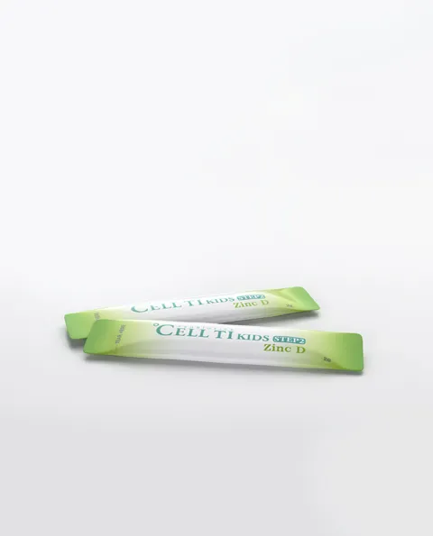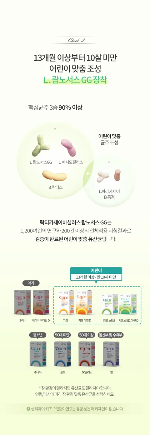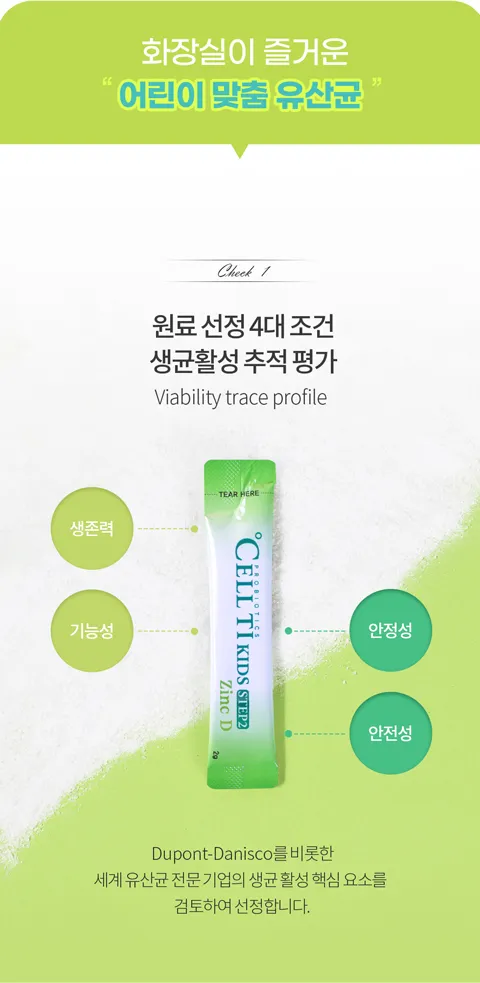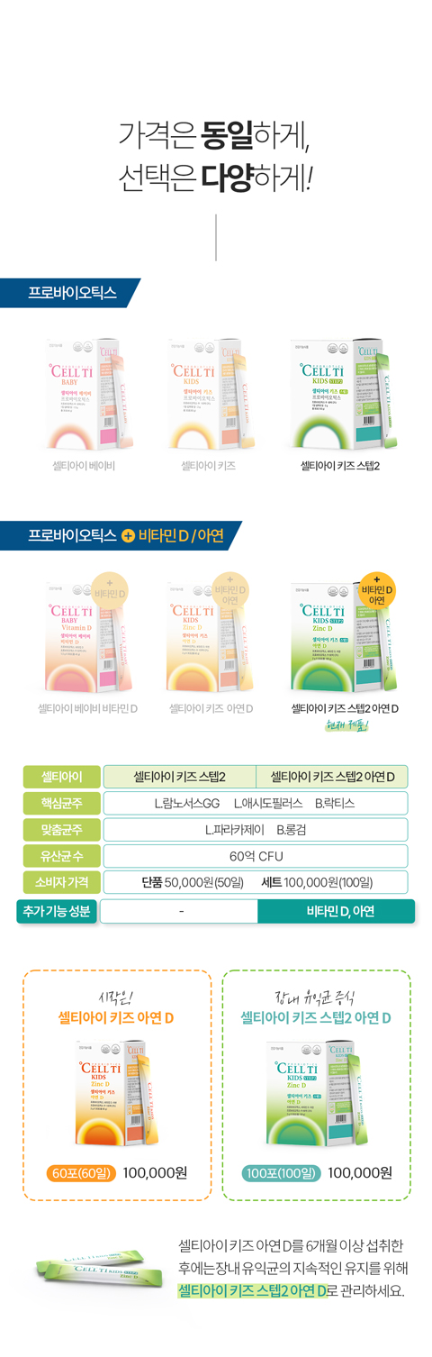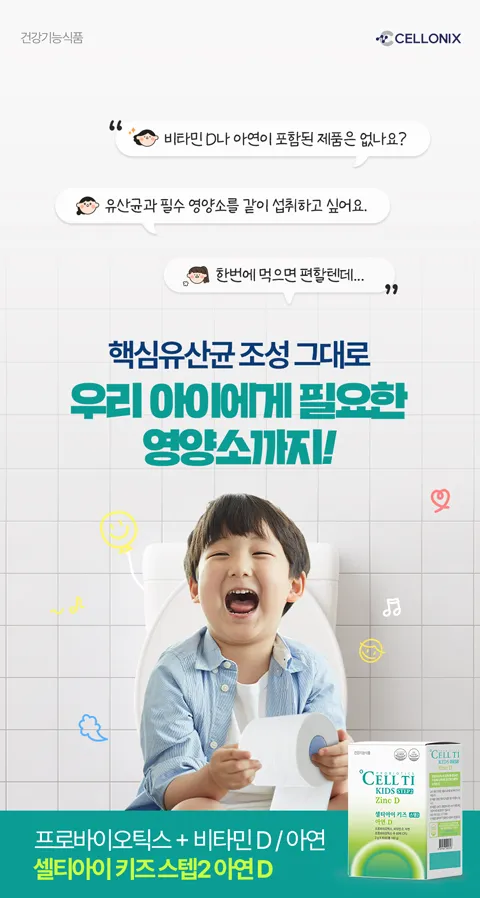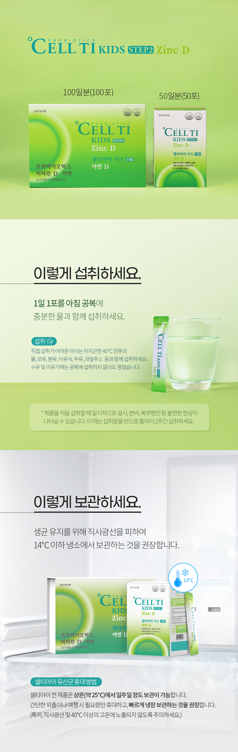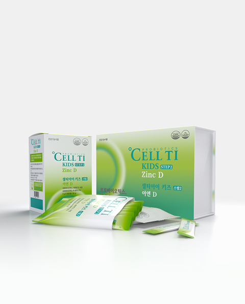 [셀티아이 키즈 스텝2 아연 D] 셀티아이 키즈 스텝2는 유산균 수 60억 CFU 이상, 비타민 D 400 IU와 아연 4 mg가 포함된 제품입니다. 셀티아이 키즈 아연 D를 6개월 이상 섭취한 후에는 셀티아이 키즈 스텝2 아연 D로 장내 유익균을 유지·관리할 수 있습니다.