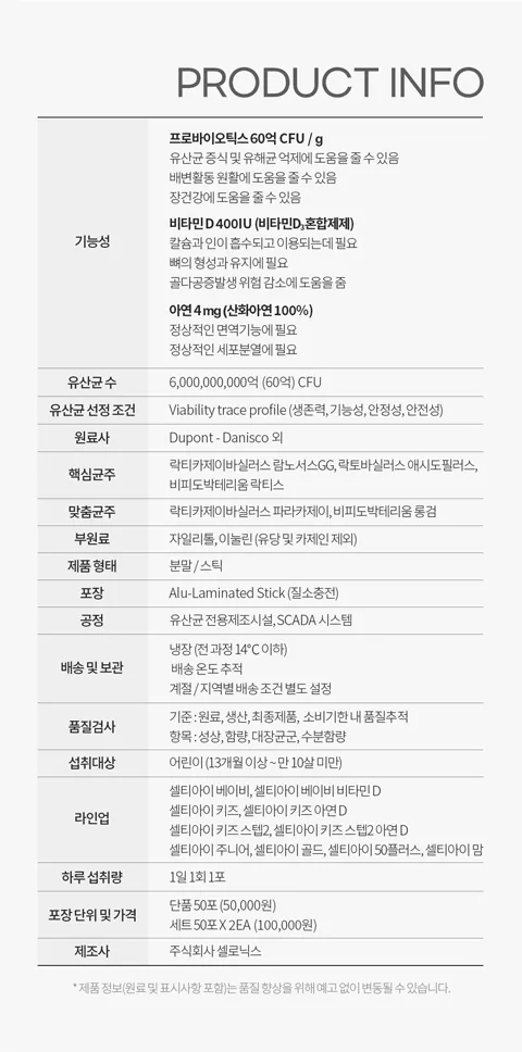 [셀티아이 키즈 아연 D] 셀티아이 키즈의 유산균 수는 100억 CFU, 비타민 D 400 IU와 아연 4 mg로 13개월 이상 ~ 만 10세 미만 어린이의 건강한 장 환경 조성과 성장에 도움을 줍니다.