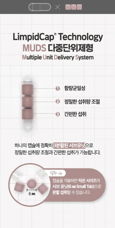 서브 유닛 단위의 개별 섭취로 정밀한 섭취량 조절이 가능하고, 큰 정제나 캡슐을 삼키기 어려운 경우에는 캡슐을 개봉하여 여러 개의 작은 크기로 분할 섭취할 수 있습니다.
