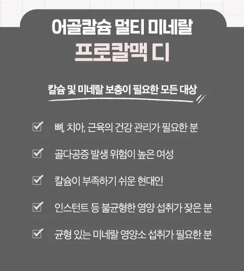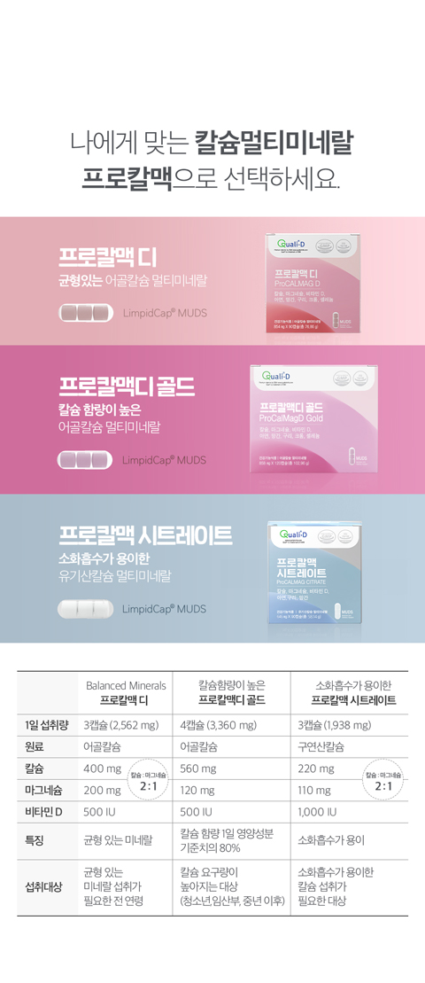 프로칼맥 브랜드는 뼈와 치아 건강 및 인체 구성을 위한 멀티 미네랄 제품입니다.