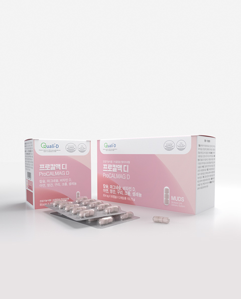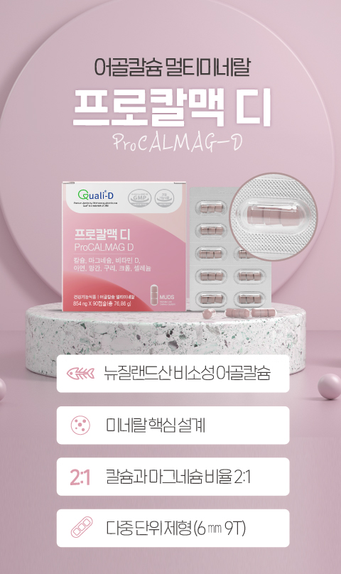 [프로칼맥 디] 어골칼슘 400 mg, 마그네슘 200 mg, 비타민 D 500 IU 어골칼슘, 마그네슘, 비타민D 위주의 균형 있는 복합미네랄 제품입니다.