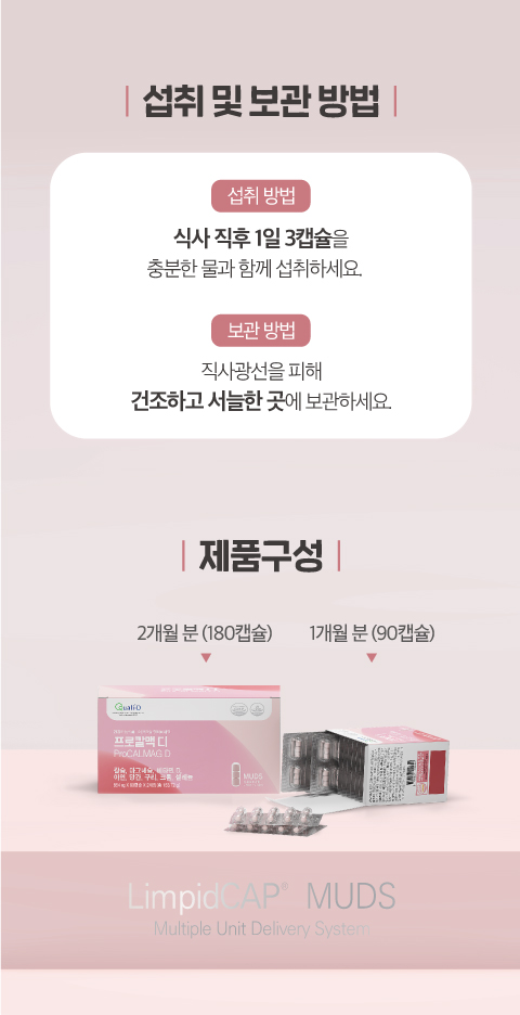 [프로칼맥디 골드] 어골칼슘 560 mg, 마그네슘 120 mg, 비타민 D 500 IU 칼슘 함량이 1일 영양성분 기준치의 80%를 충족하는 제품으로 칼슘 요구량이 높아지는 임산부, 청소년, 중년 이상 성인에게 추천합니다.