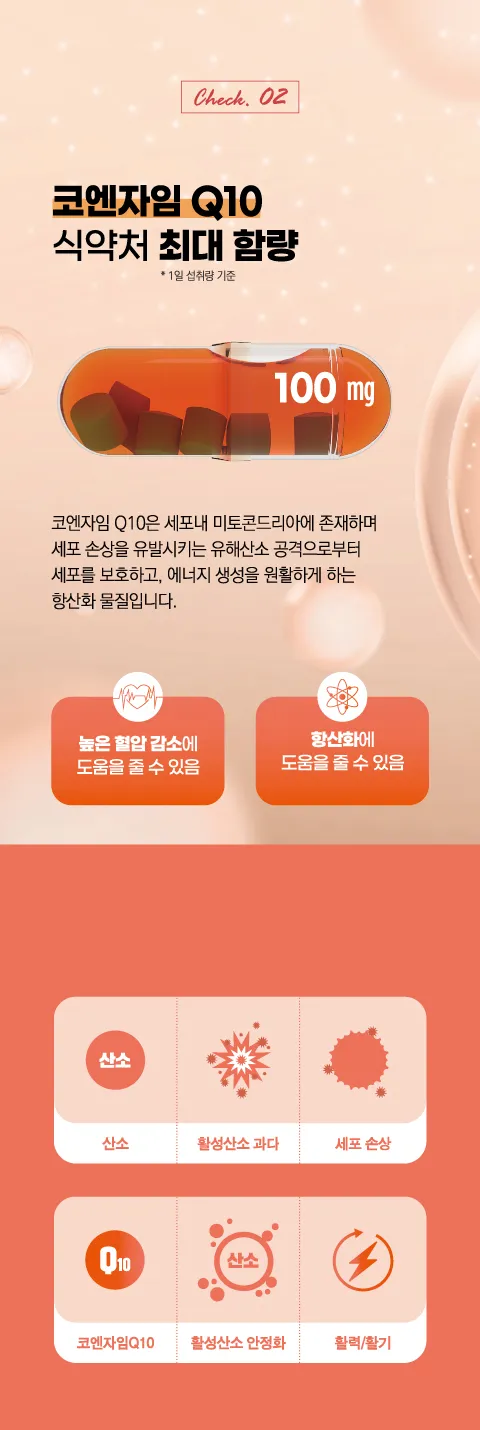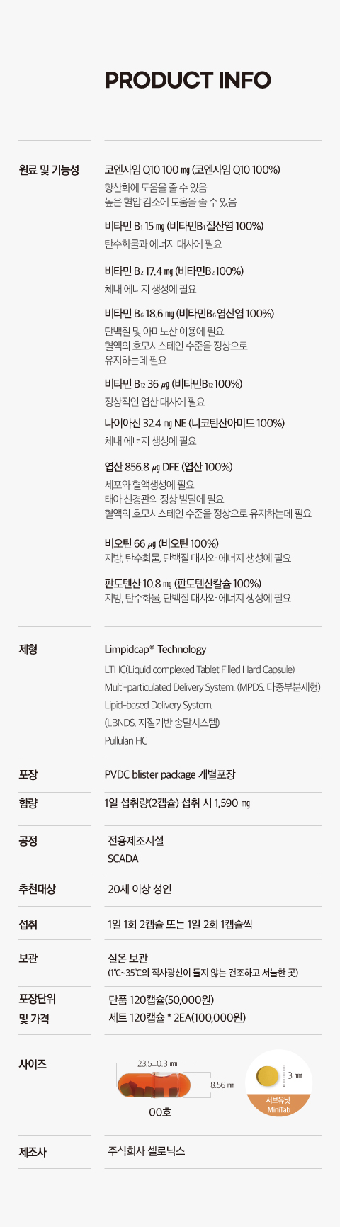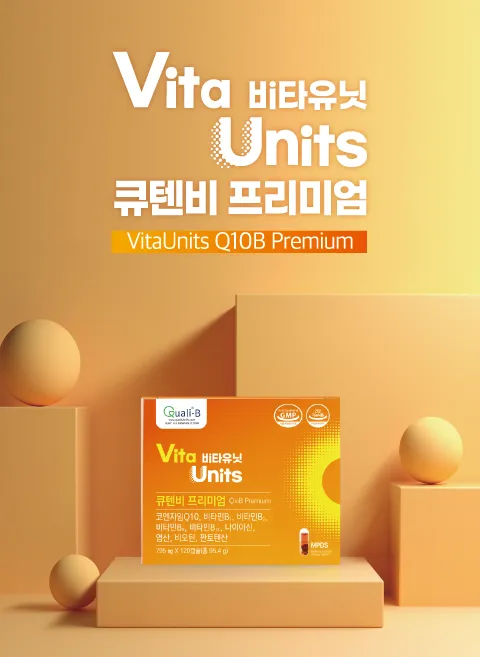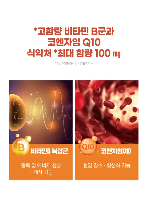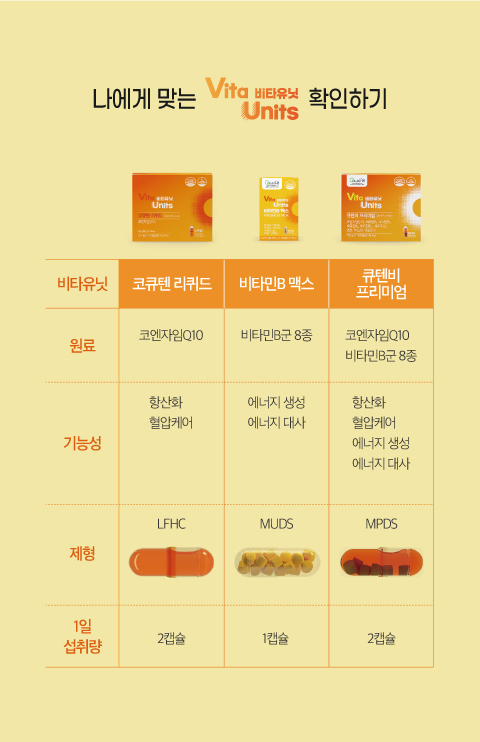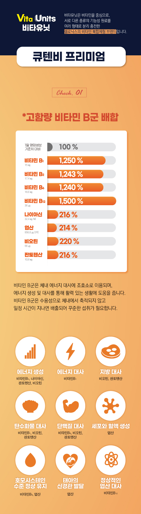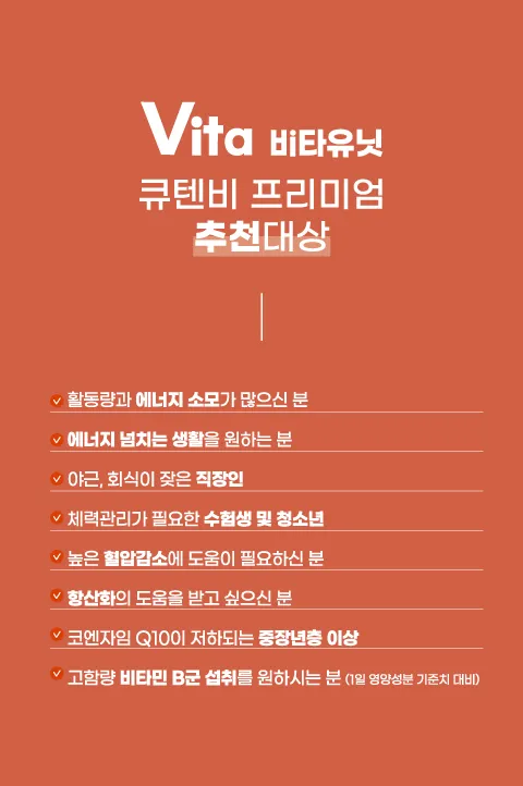 [비타유닛 큐텐비 프리미엄] - 원료 : 코엔자임Q10, 고함량 비타민B군 8종(1일 영양성분 기준치 대비) - 기능성 : 항산화, 혈압 케어, 에너지 생성 및 대사