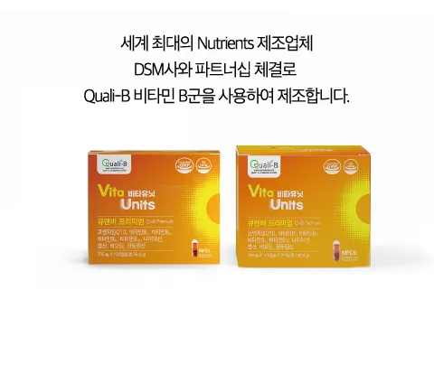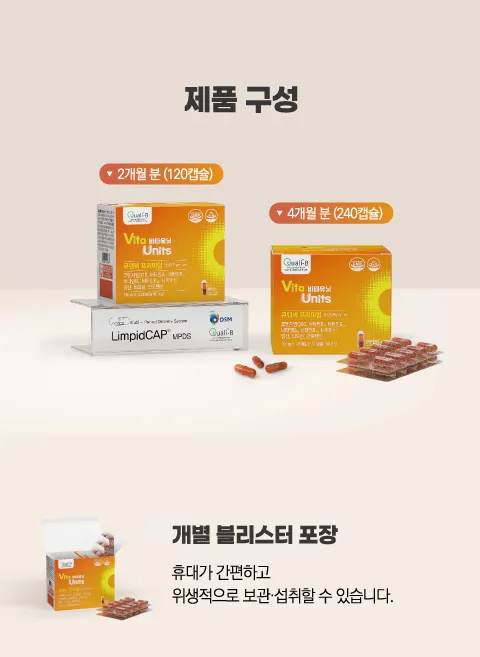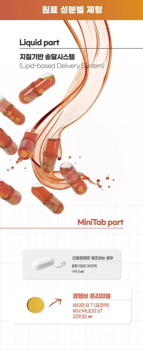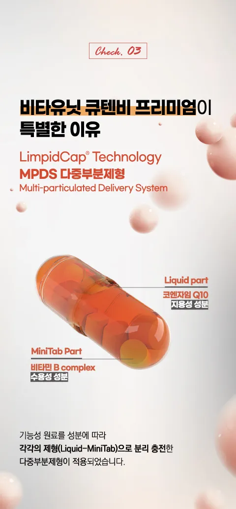 비타유닛 큐텐비 프리미엄은 지용성 성분인 코엔자임 Q10과 수용성 성분인 비타민 B군의 성분을 고려하여 Liquid와 MiniTab으로 분리 충전하였습니다.