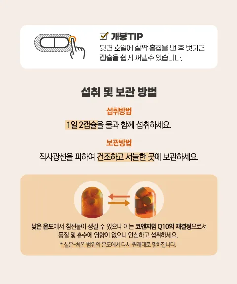 낮은 온도에서 침전물이 생길 수 있으나 이는 코엔자임 Q10의 재결정으로서 품질 및 흡수에 영향이 없으니 안심하고 섭취하세요. (실온~체온 범위의 온도에서 다시 원래대로 맑아집니다.)