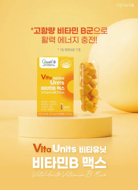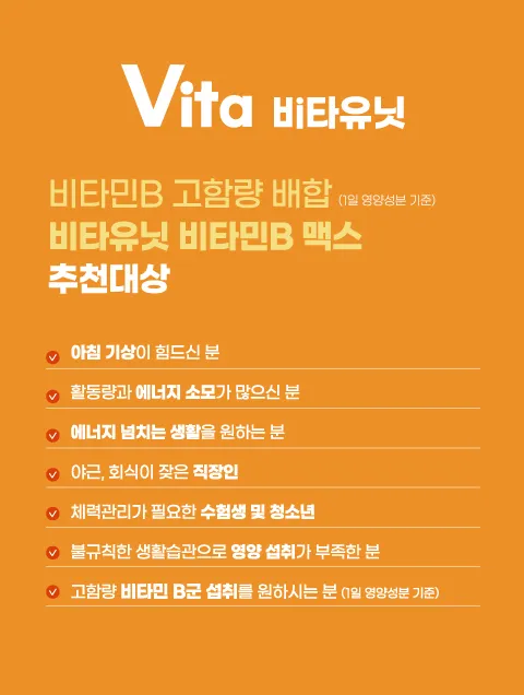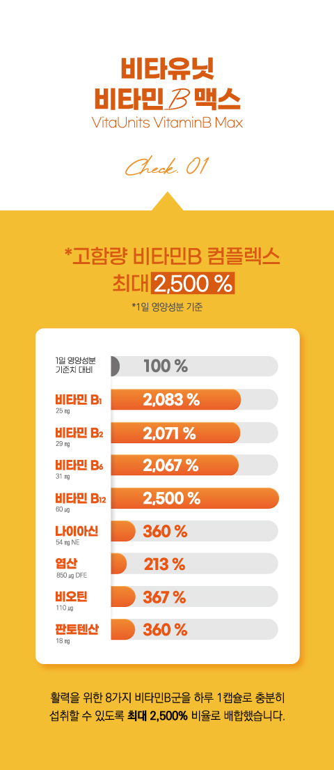 [비타유닛 비타민B 맥스] - 원료 : 고함량 비타민B군 8종(1일 영양성분 기준치 대비) - 기능성 : 에너지 생성 및 대사