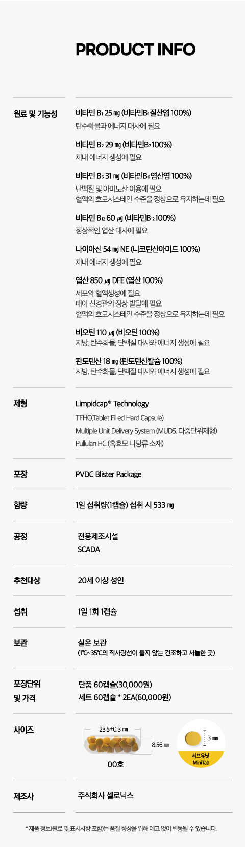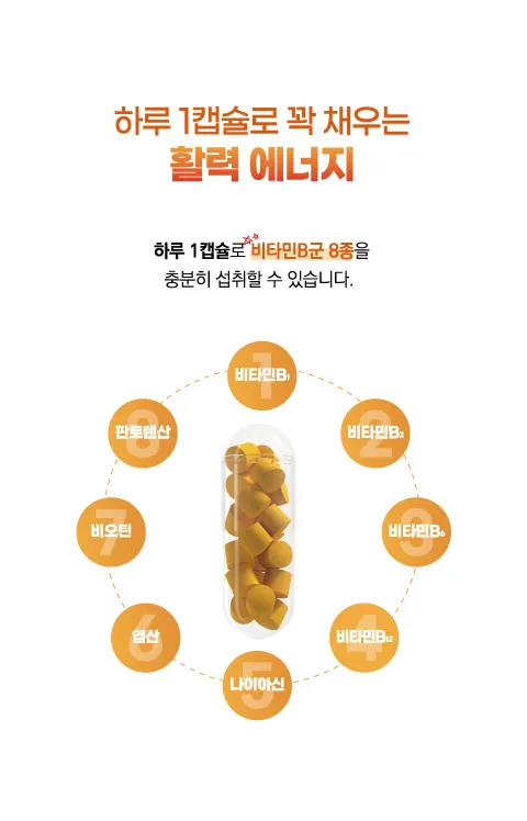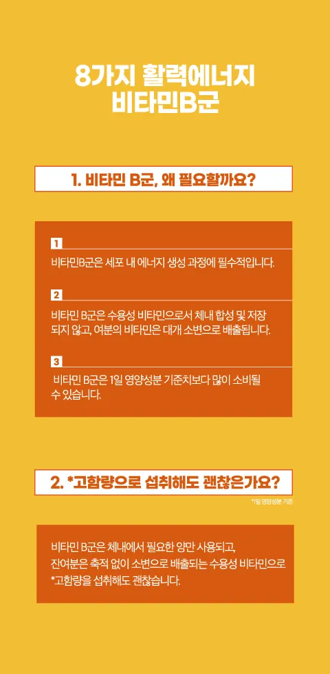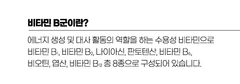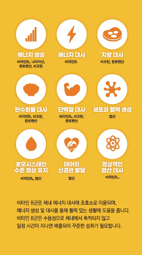 비타민 B군은 체내에서 필요한 양만 사용되고, 잔여분은 축적 없이 소변으로 배출되는 수용성 비타민입니다.