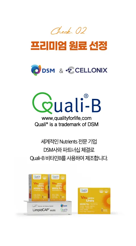 [비타유닛 큐텐비 프리미엄] - 원료 : 코엔자임Q10, 고함량 비타민B군 8종(1일 영양성분 기준치 대비) - 기능성 : 항산화, 혈압 케어, 에너지 생성 및 대사