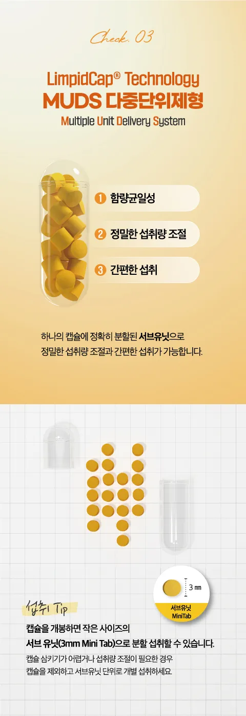 서브 유닛 단위의 개별 섭취로 정밀한 섭취량 조절이 가능하고, 큰 정제나 캡슐을 삼키기 어려운 경우에는 캡슐을 개봉하여 여러 개의 작은 크기로 분할 섭취할 수 있습니다.