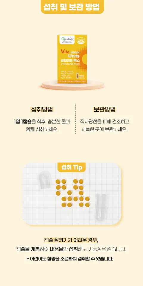 비타민B 섭취가 필요한 아이라면, 캡슐을 제거하고 서브유닛 단위로 섭취량을 조절해서 섭취해도 좋습니다.