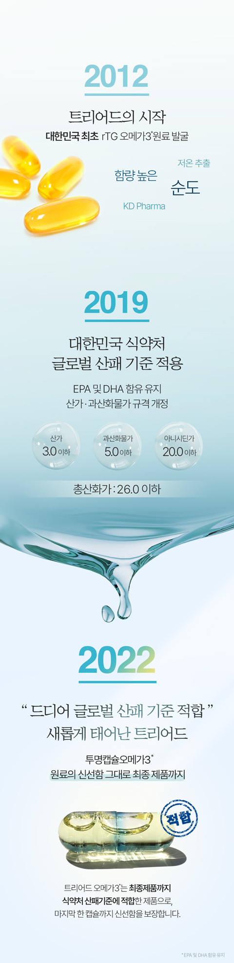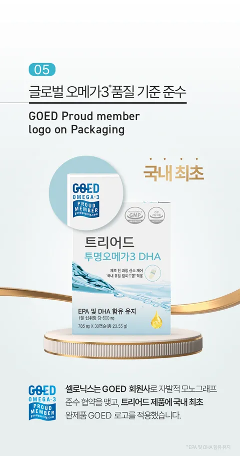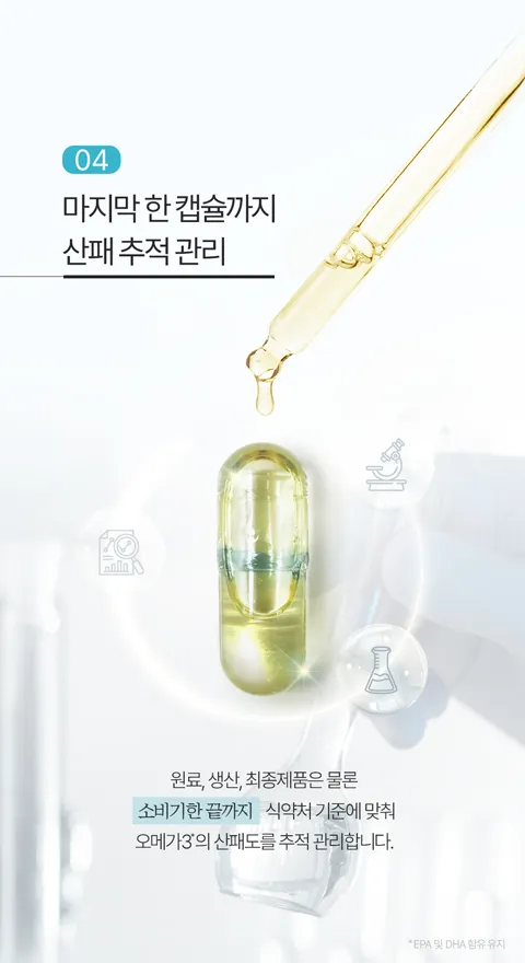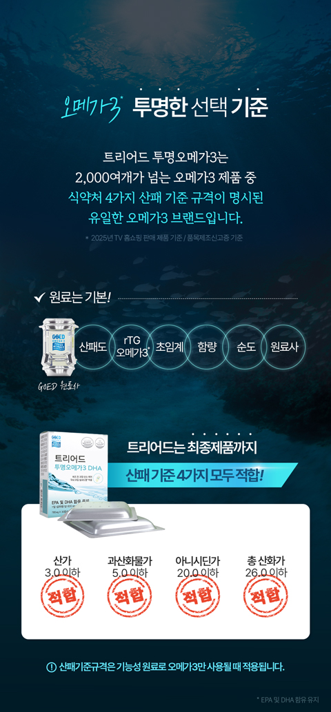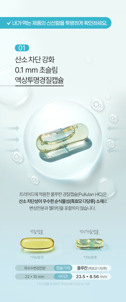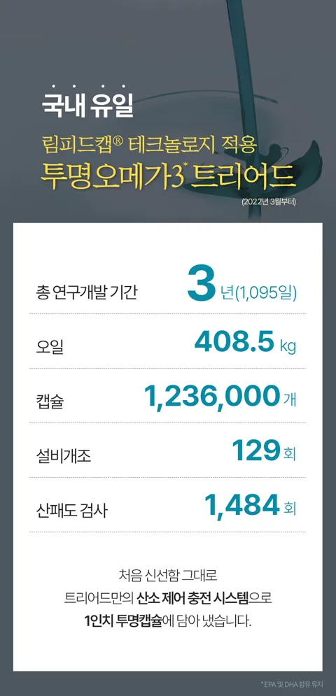 [산패 기준적합] 식약처 산패 기준에 적합한 안전한 오메가3를 선택하세요. 트리어드 투명오메가3 DHA는 림피드캡® 테크놀로지를 적용으로 최종제품까지 산패기준에 적합한 오메가3입니다.