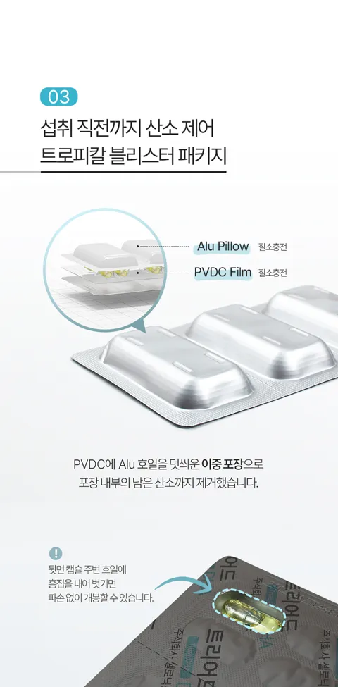 [보관] 블리스터를 개봉하지 않은 상태에서 직사광선을 피할 수 있는 서늘한 곳에 보관하세요. 냉장/냉동보관이 품질에 영향을 미치지 않으나, 과냉각된 캡슐은 누르면 깨질 수 있으니 냉동보관하는 경우 실온에 잠시 두었다가 개봉하세요.