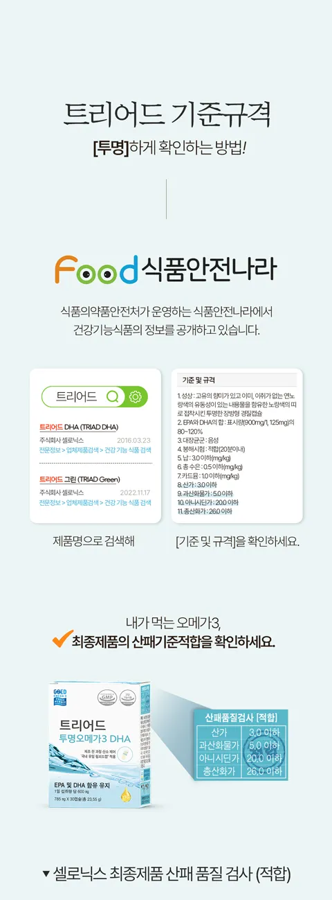 트리어드 투명오메가3는 “원료”는 물론, 소비자가 섭취하는 “최종제품”까지 식약처 산패품질기준에 적합합니다.