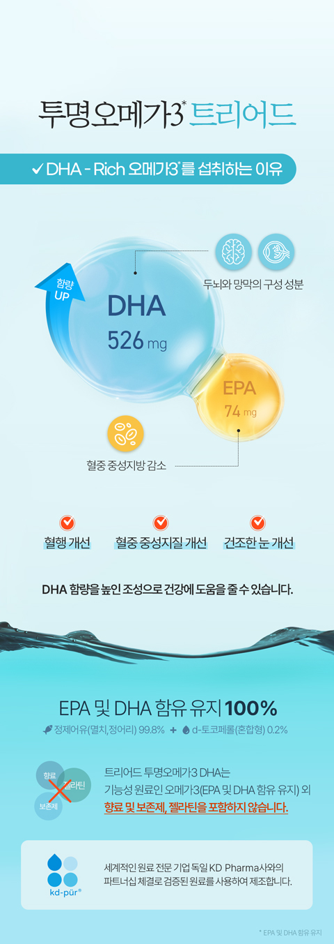 트리어드 투명오메가3는 자연 형태와 유사한 rTG 분자구조로 순도가 높고, 흡수 및 생체이용률이 우수합니다. EPA 및 DHA 함유 유지는 함량에 따라 혈행개선과 혈중 중성지질 개선, 건조한 눈 건강 개선, 기억력 개선에 도움을 줄 수 있습니다.
